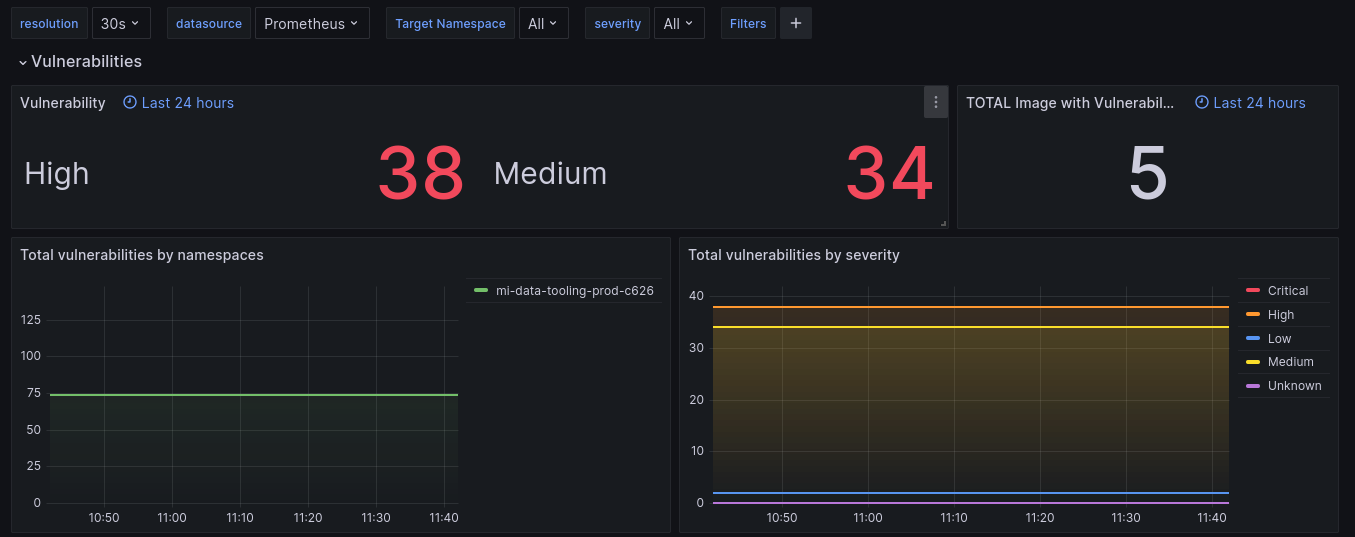 Le dashboard Trivy Operator permet de consulter les vulnérabilités (CVE) et criticité pour les différentes workload ainsi que leur évolution dans le temps.